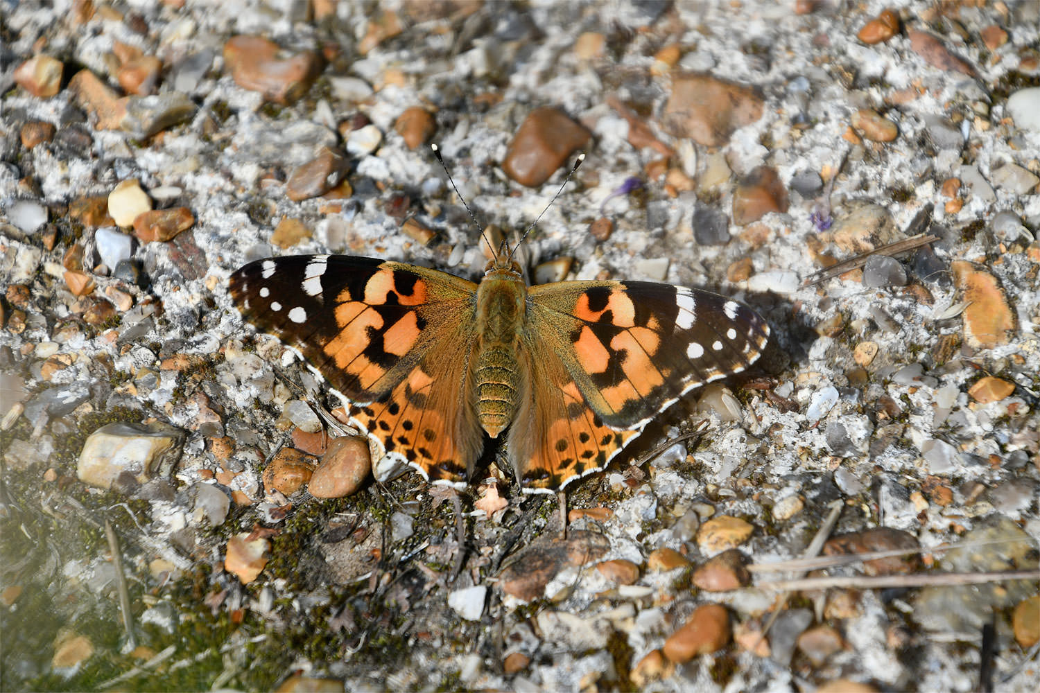 This hardy migrant is Iceland's only butterfly and can arrive in the UK in huge numbers from North Africa and the Middle East. It loves basking in the sun, and its eggs are laid on thistles, Common Nettles, mallows, and Viper's Bugloss. The black and grey caterpillars have a continuous yellow line along the sides. The adults may be seen from April until October, the sexes being similar.