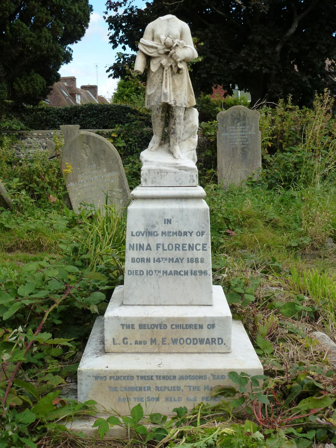 At a glanceAt a glanceSurname: WoodwardFirst name: NinaOther Christian names: Florence Gender: FemaleChildren: NoBurial number: 262Born: 14/5/1888Died: 10/03/1896Buried: 14/03/1896Occupation: Daughter of Louis and Mary Woodward The GraveThe graveCemetery area: EBCemetery row: 4Cemetery plot: 27what3words location: https://what3words.com/legend.terms.soundBurial remains: Unknown The headstoneEndowed grave: YesHeadstone description: EndowedGrave: Cut grass and keep tidy.Headstone inscription: In loving memory of Nina Florence born 14th May 1888 died 10th March 1896. The beloved children of L.G. and M.E. Woodward. "Who plucked these tender blossoms?" said the son. The gardener replied "The Master" and the son held his peace. Dorothy born 10th May 1897 died 10th May 1897 Vera Constance born 30th Nov 1889 died 16th Feb 1976 Leslie Gordon born 25th April 1907 died 18th March 1912 Life storyLife storyNina was born in Manchester, the daughter of Louis George and Mary Ellen Woodward. By 1901, the family had moved to Worthing where Louis set up a dairy and creamery in Brunswick Road. Later he moved to bigger premises on the corner of Queen's Road and Rowlands Road. Nina died on 10th March 1896 of influenza and tubercular meningitis.Burial researcher: Gail Warner-Clarkson Further informationBirthDate born: 14/05/1888 DeathDeath (details)Date of death: 10/03/1896Age (at time of death): 7Cause of death: Influenza. Tubercular meningitis.Address at time of death: 33 Rowlands Road, Worthing, Sussex, England Census and miscellaneous informationCensus information1891 census: 4 Brunswick Road, Worthing. Louis aged 30, dairyman milk. Mary aged 26, assisting husband. Harold aged 4. Nina aged 2. Vera aged 1. Previous Random burial Next
