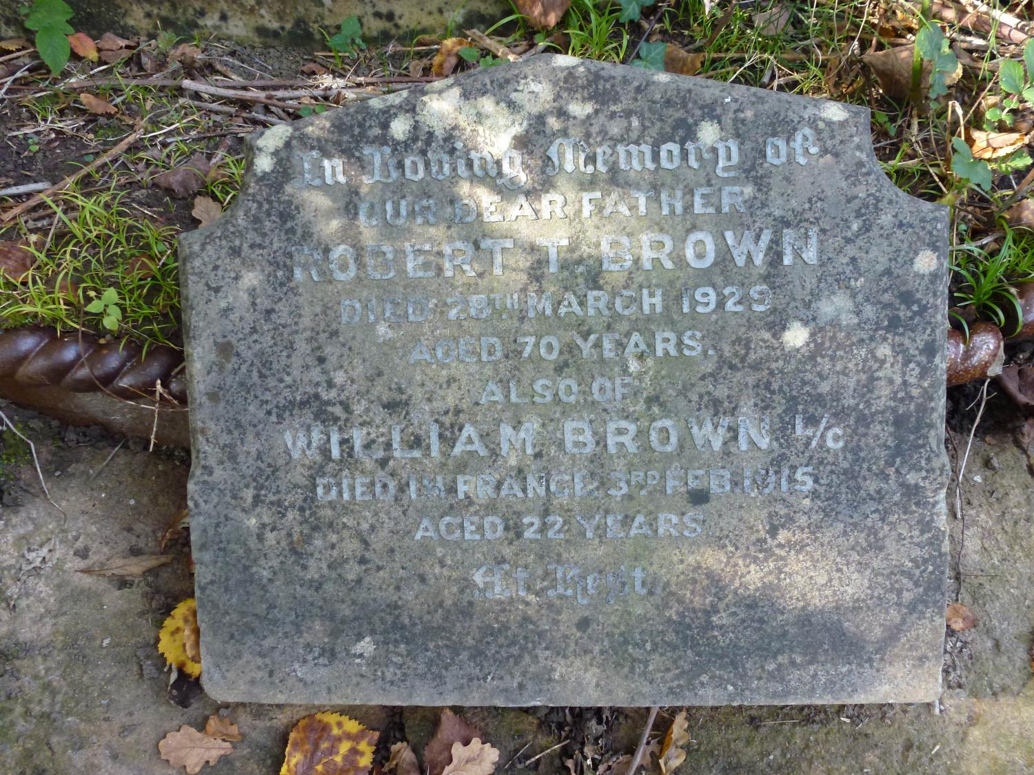 In loving memory of our dear father Robert T Brown died 28th March 1929 aged 70 years also of William Brown L.C. died in France 3rd February 1915 aged 22 years "At rest"