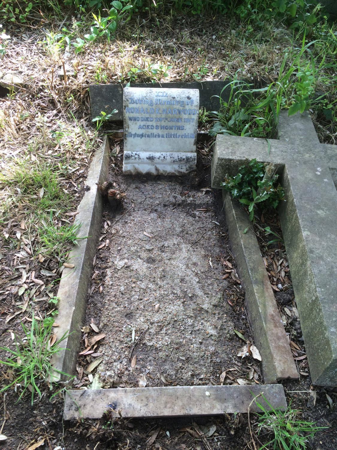 At a glanceAt a glanceSurname: HarwoodFirst name: RonaldOther Christian names: Eugene Gender: MaleChildren: NoBurial number: 871Born: 0/10/1916Died: 29/06/1917Buried: 03/07/1917Heene Hallmark: NoCommonwealth War Grave: No The GraveThe graveCemetery area: SESCemetery row: 12Cemetery plot: 19what3words location: https://what3words.com/patio.pile.moneyBurial remains: Unknown The headstoneHeadstone inscription: In loving memory of Ronald E Harwood who died 29th June 1917 aged 8 months "Jesus called a little child" Life storyLife storyWhen Ronald Eugene Harwood was born in Worthing in October 1916, his father, George, a bricklayer, was 44 and his mother, Florence Clara Gore, was 41. He had two brothers. He died on 29 June 1917 and was buried in Heene Cemetery, West Worthing, Sussex.Burial researcher: Pat Brownbill Further informationBirthDate born: 00/10/1916 DeathDeath (details)Date of death: 29/06/1917Cause of death: UnknownAddress at time of death: Worthing, West Sussex, England Previous Random burial Next