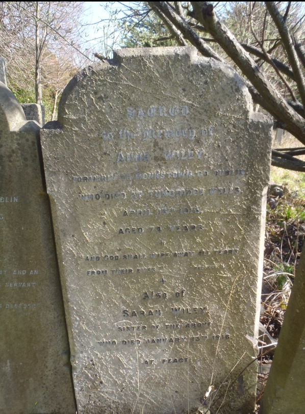 At a glanceAt a glanceSurname: WileyFirst name: SarahOther Christian names: Gender: FemaleChildren: NoBurial number: 812Born: 0/0/1842Died: 13/01/1916Buried: 17/01/1916Heene Hallmark: NoCommonwealth War Grave: No The GraveThe graveCemetery area: NWSCemetery row: 9Cemetery plot: 19what3words location: https://what3words.com/text.sentences.sillyBurial remains: Unknown The headstoneEndowed grave: YesHeadstone description: EndowedGrave: Cut grass and keep tidy.Headstone inscription: Sacred to the memory of Anne Wiley formerly of Monkstown, Co. Dublin who died at Tunbridge Wells April 15th 1915 aged 74 years "And God shall wipe away all tears from their eyes" Rev. XXl 4 Also of Sarah Wiley sister of the above who died January 13th 1916 "At peace" Grave location map Life storyLife storySarah was one of the 13 children of William Wiley, a barrister, and his wife, Margaret Matilda, nee Ormsby. She was born in Monkstown, Co. Dublin, but by 1881 she living at 49, Marine Parade, Broadwater, with her widower father and oldest brother, John. In 1891 she was living with her unmarried sister, Anne, and widowed sister, Frances, and children at 3, Heene Villas, Heene Road, Worthing. In 1901 she was a visitor at Christchurch in Hampshire, and in 1911 she was living alone in 2 rooms in Eriswell Road, Worthing. She died on 13 January 1916 at Caer Gwent, a nursing home in Wykeham Road, Worthing.Burial researcher: Angela Levy Further informationBirthDate born: 00/00/1842 DeathDeath (details)Date of death: 13/01/1916Age (at time of death): 73Cause of death: UnknownAddress at time of death: Caer Gwent, Wykeham Road, Worthing, Sussex, EnglandUsual address at death: Caer Gwent, Wykeham Road, Worthing, Sussex, England Personal effectsExecutors: Samuel Broomhead Ward status: SolicitorProbate pounds: £594 Census and miscellaneous informationCensus information1851 census: Not found1861 census: Not Found1871 census: Not Found1881 census: 49, Marine Parade, Worthing William Wiley, 66, head, widower ,barrister-at-law, not practicing, retired; John Wiley, 44, son ,late Capt. 18th Foot, retired to reserve; Sarah Wiley, 37, daughter;1891 census: 3, Heene Villas, Heene Road, Worthing Anne Wiley, 50, living on own means; Sarah Wiley, 49, living on own means; Frances E Favell, 42, widow; Margaret L Favell, 14, niece, scholar; Frances E O Favell, 12, niece, scholar; Ethel L Puzey, 11, visitor; plus a cook and a housemaid1901 census: 15, St James Villas, St Faith Within, Christchurch, Hampshire Rebecca Macaulay, 70, head, living on own means; Sarah Wiley, 59, visitor1911 census: Eriswell Road, Worthing Sarah Wiley, 69; Previous Random burial Next