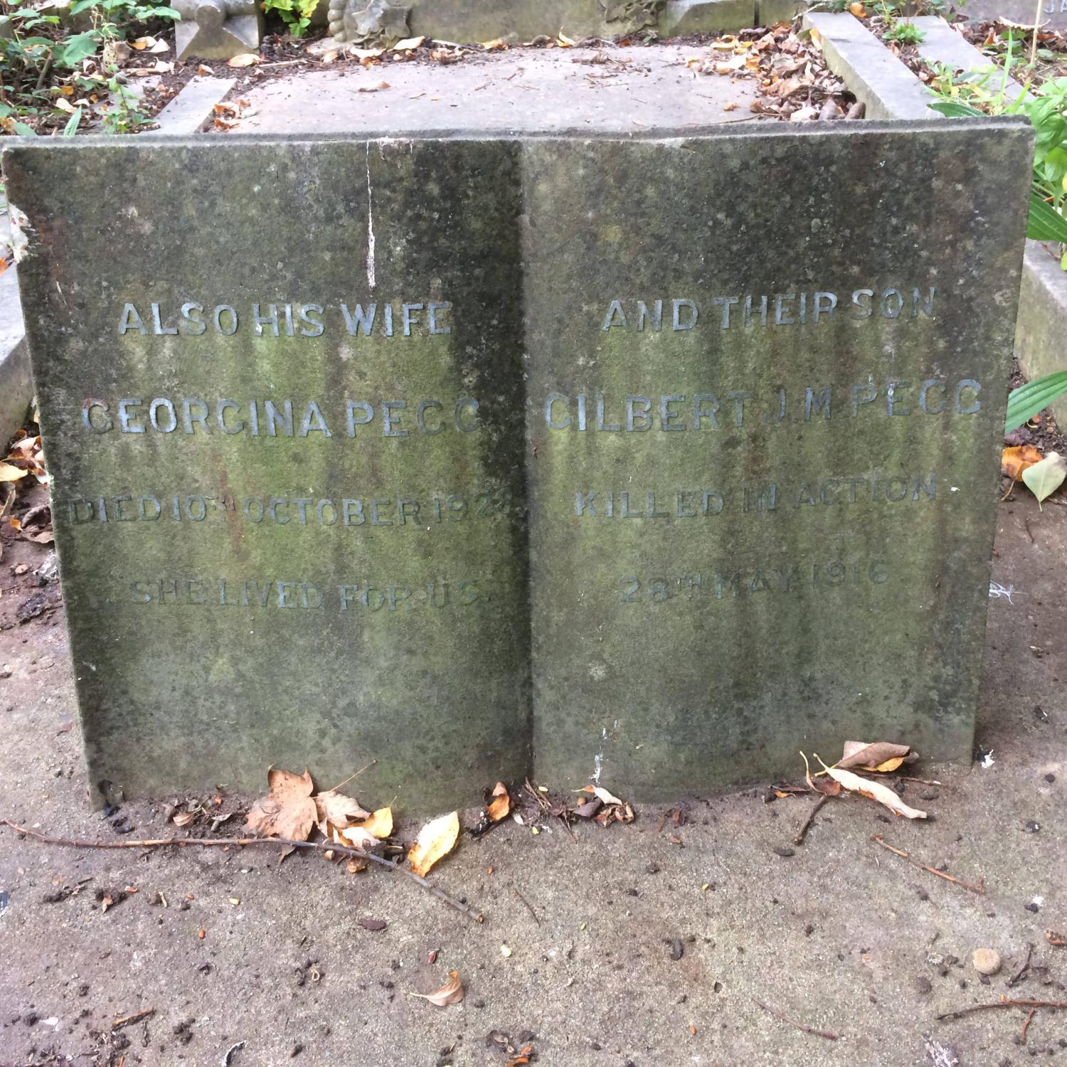 Gilbert Joseph Martin Pegg was born in 1877 Windsor to William Pegg aged 25yrs and working as a Tailor, and Georgina aged 26yrs. 1881 Census Living at 4 Albert Villas, Archway Road, Hornsey Middlesex: William J 28yrs Tailor, Georgina 29yrs, Gilbert J 4yrs, Gertrude J 2yrs, Georgina 3mths, Ellen J 20yrs Sister and one servant 1891 Census Living at 1 South Cottage, Wimbledon Common West Side: Willia J 38yrs Merchant Tailor, Georgina 38yrs, Gilbert J M 14yrs Scholar, Gertrude J 13yrs, Georgina 10yrs, Ernest A 8yrs, William J 5yrs, Eliza Gilbert 29yrs Sister in Law On the 13th March 1902 Gilbert Pegg, aged 23yrs, left Liverpool to St John Canada on the Allan Line "Parisian" stating his occupation as "Labour" By 1906 we find him living in Humboldt, Saskatchewan, Canada Records show him as an incoming passenger from New York to Liverpool on White Star Dominion Line "Cedric" with Rachel and Gilbert Junior on the 7th May 1911. GILBERT JOSEPH MARTIN PEGG volunteered for short service with the King’s Royal Rifles and served in South Africa with the 1st Special Service Company. He was discharged in June 1901. After emigrating to Manitoba, he enlisted in January 1915, serving with the Canadian Army Service Corps. He was killed by shell fire south of Bussebom, Belgium, on 28 May 1916 and is buried in the Poperinghe New Military Cemetery. (With copied research.)