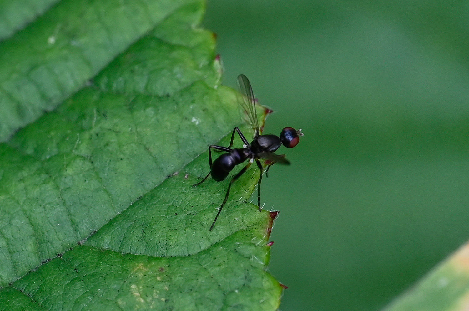 Ensign flies - or black scavenger flies - number about 300 worldwide. They are often ant mimics and are notable for the way in which they wave their wings.
