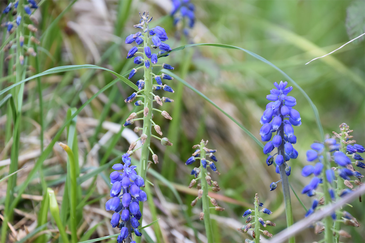 The familiar Garden Grape Hyacinth is a garden cultivar that flowers from March.